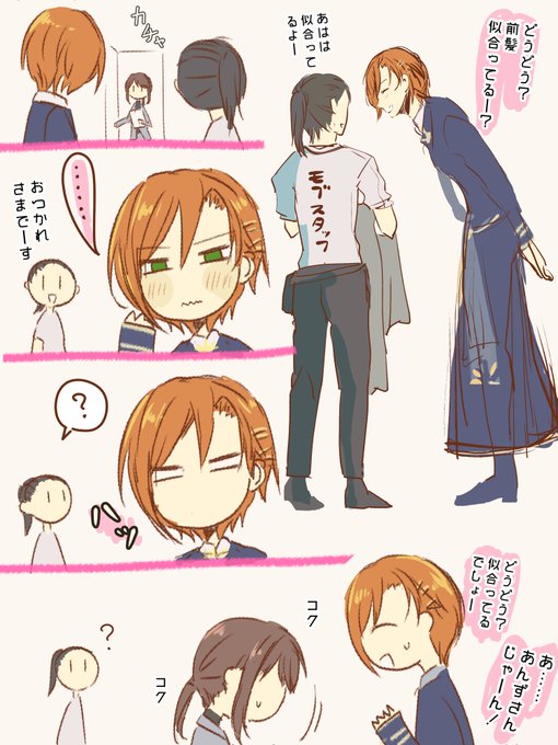 「どうどう? 似合ってる?」 仲の良い衣装さんにヘアメを見せに来るひなたくん ※あんずさんで描こうとしたらひなたくんに並々ならぬ緊張が走ったので止めた