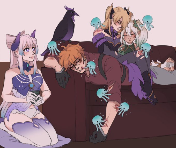 my team after a long day of farming #Genshinlmpact #Genshinlmpactfanart #childe #kokomi #nahida #fischl