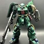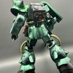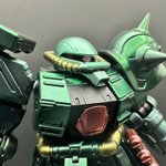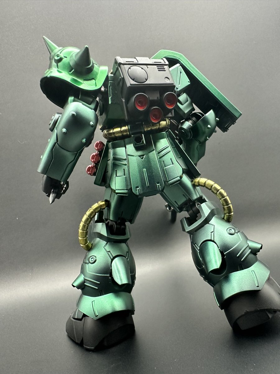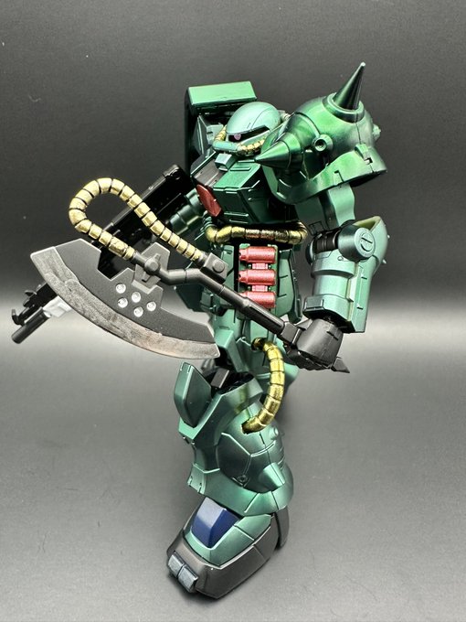 食玩のGフレームFAのザクⅡ改を塗装の練習に…手間かかったけど出来た☺️ サフ無し表面処理無しからスタート、黒光沢→クリスタルカラー08→クリア緑〆 吹く量が均一になるようにしないとダナ。 手足も短縮済。 #ガンプラの画像を貼るとRTされると聞いて #ガンプラ #ガンプラ好きと繋がりたい