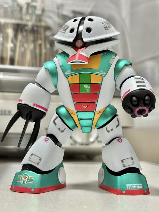 おはようございます〜☀ 昨日完成してたんですが そのまま寝ちゃってたので おはようツイートついでに アッガイセブンイレブンカラーです 動きがコミカルで非常に可愛らしい 一様全塗装ですがシールはそのまま使用 #ガンプラ #ガンプラの画像貼るとRTされると聞いて #ガンプラ好きと繋がりたい