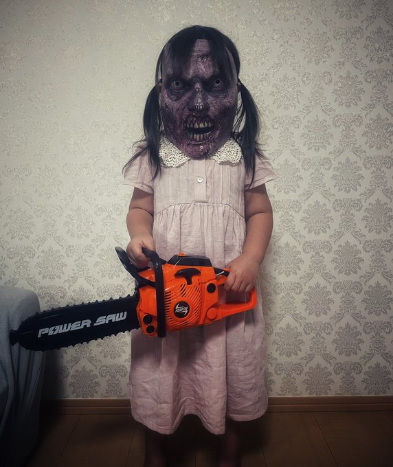ZANさんが娘におもちゃのチェーンソーを送ってくれたんだけど、ゾンビのお面と同時に装備させたら一番ヤバいタイプのキラーに仕上がって想像の7倍くらい怖かった