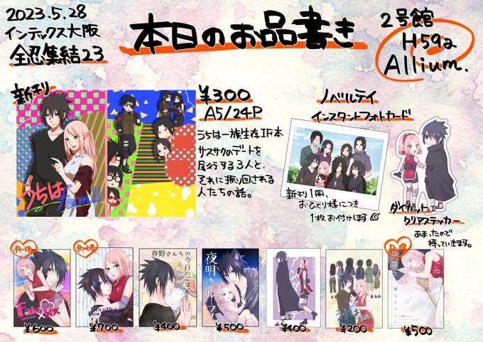 【全忍23】お品書き【サスサク】 | Ichi(イチサン) #pixiv pixiv.net/artworks/10832… 【新刊通販】ecs.toranoana.jp/joshi/ec/item/… 5/28 インテックス大阪 全忍集結23 2号館H59a「Allium」 会場限定でノベルティございますよろしくお願いします