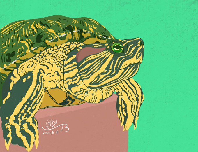 日付が変わってしまいましたが、ミシシッピアカミミガメのアッシュちゃんを描かせていただきました😊 とっても可愛い子です🐢💕 イラストに興味がないうちのクーさん(アカミミ)がガン見していました😁若さに嫉妬したのかな笑 #イラスト #ミシシッピアカミミガメ