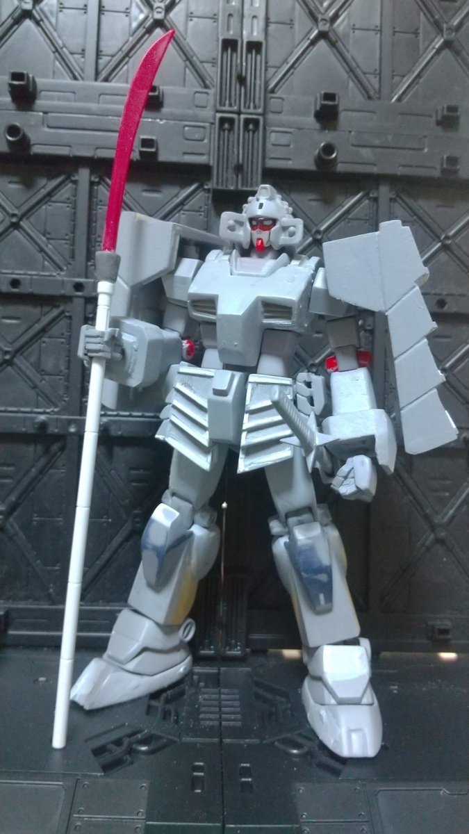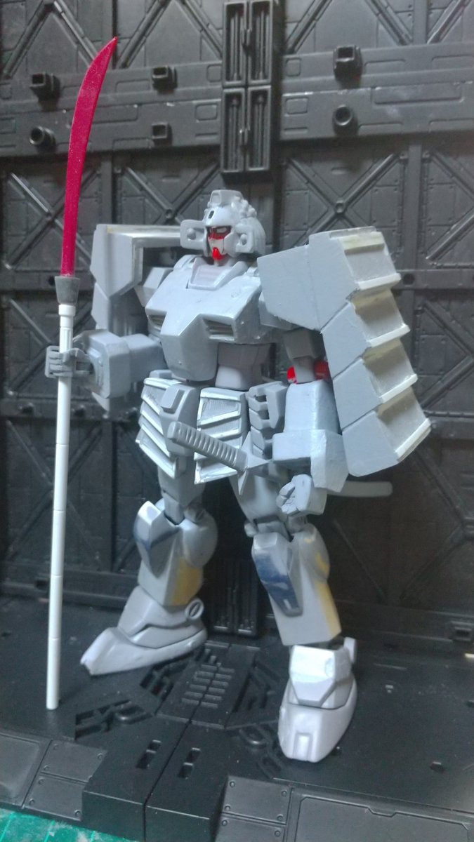 #寒い冬は白い作品を貼る #プラモ狂四郎 #ガンプラ モデフェスには間に合わなかった、HGUC21番改造のセミアーマードガンダムと、製作中の狂四郎版武者ガンダム。セミアーマードはアーマーがパージ出来ません。武者ガンダム はごつめに作ってます。