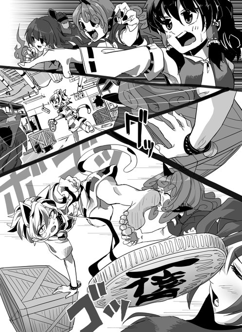 格好いいミケちゃんを描きたかった(2P) #東方Project #博麗霊夢 #豪徳寺ミケ #高麗野あうん #依神紫苑