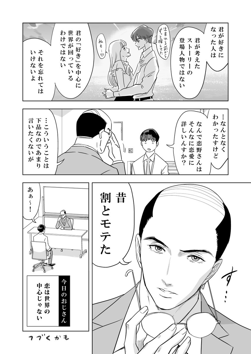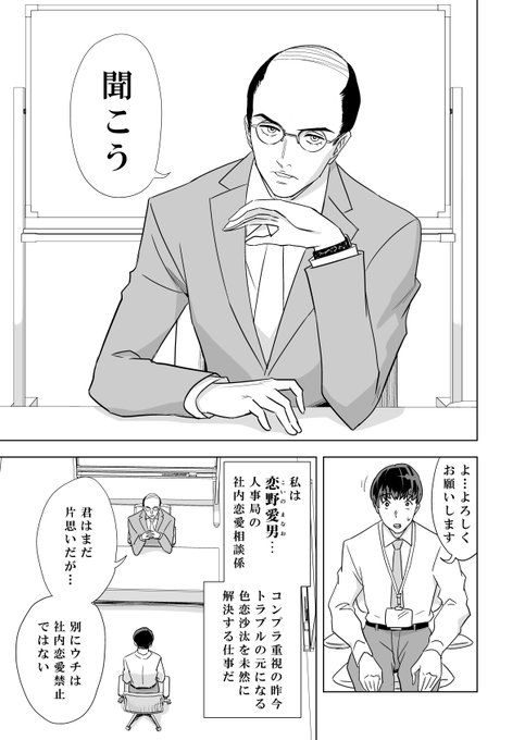 「恋のおじさん恋野さん」2話です。社内の恋愛トラブル防止のために若手社員の相談に乗る人事のイケオジ・恋野さん。恋に暴走気味な男子社員に冷静にツッコみ、女性の気持ちを思いやる大切さを説いていきます。 #漫画が読めるハッシュタグ #恋愛あるある