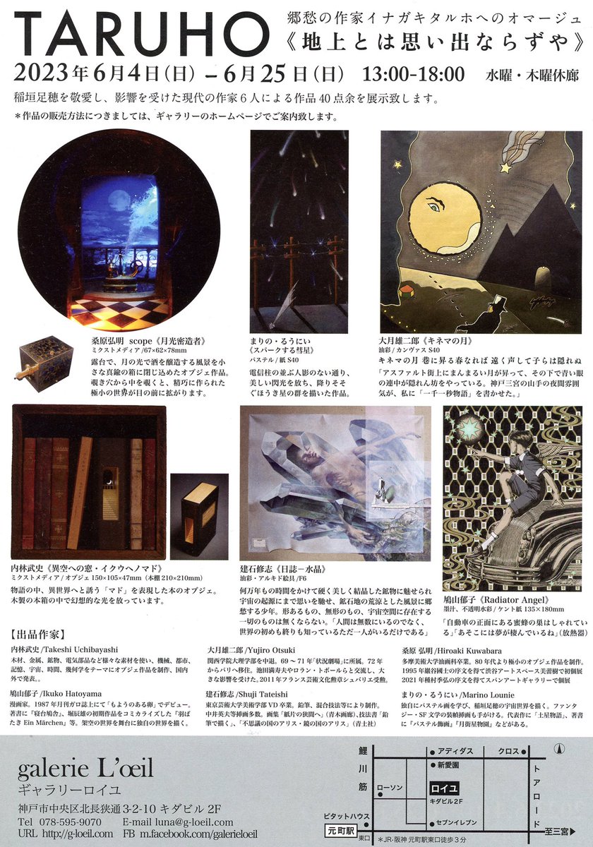 引き続き全ての作品は最終日6月25日(日)までご覧いただけます。私はポストカードセットも会場にて販売中!六月の神戸へ是非お越しの上、ご鑑賞下さいませ。 ★《地上とは思い出ならずや》TARUHO 稲垣足穂オマージュ展 ギャラリーロイユ g-loeil.com 6月4日(日)~6月25日(日) 水・木休