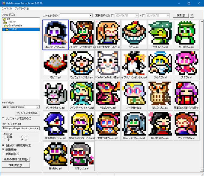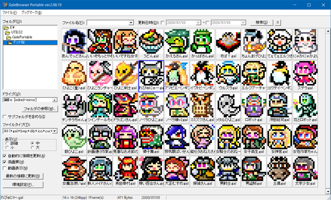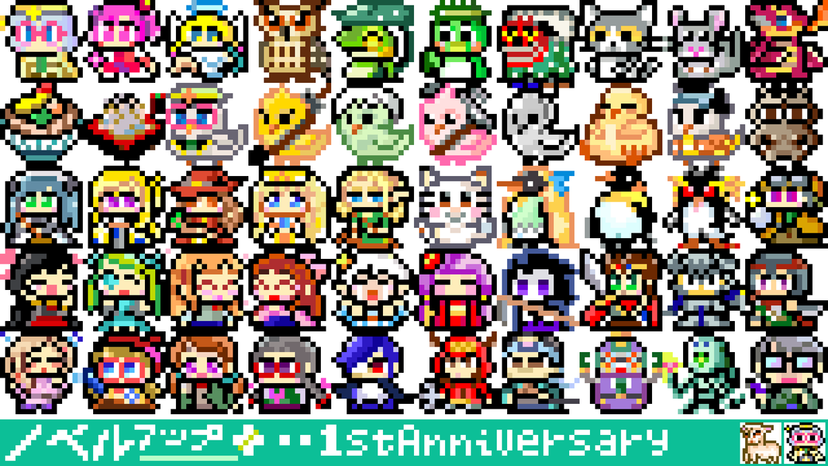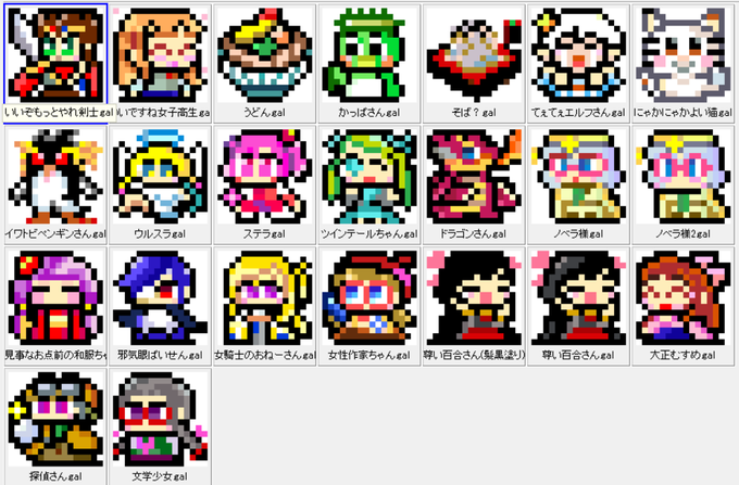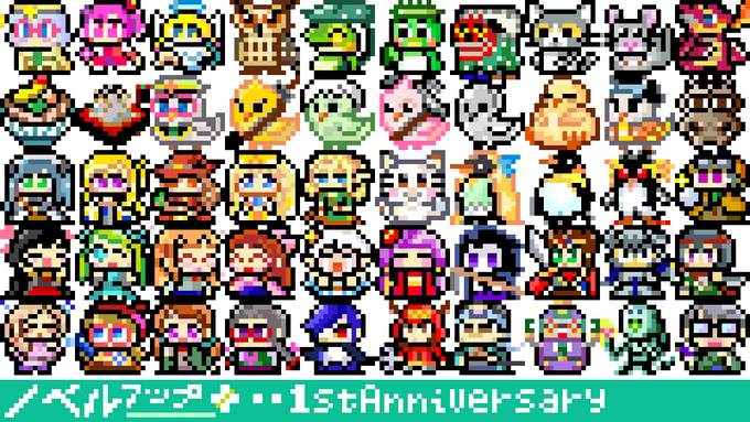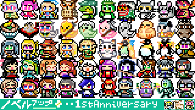 一段落ついたので50キャラ分のPNGアーカイブ(オリジナルサイズ&12倍角)をうpりました。 i486.mods.jp/npfortune/nove… 利用規約を正しく守ってご自由にお使いくだされ('-`) #ノベルアッププラス #ドット絵