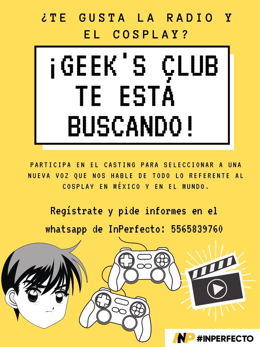 #Casting En @InPerfectoMx te estamos buscando. Si te gusta hacer radio y #Cosplay checa la convocatoria y se parte de quienes conducen el programa: Geek's Club en InPerfecto. inperfecto.com.mx