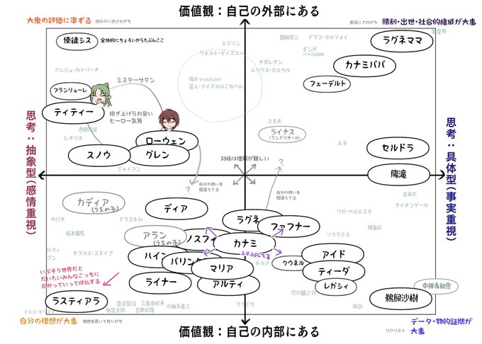 人間4タイプ分類 暇なときに頭のなかでよくやってるやつを出力してみました(参考に関係ない人物を入れてみたらカオスになった) いぶそうに限らず基本エンタメキャラは左下に分布しがちなんだけど、現実では右上分布の人間が社会を回すのに必要不可欠 #異世界迷宮の最深部を目指そう