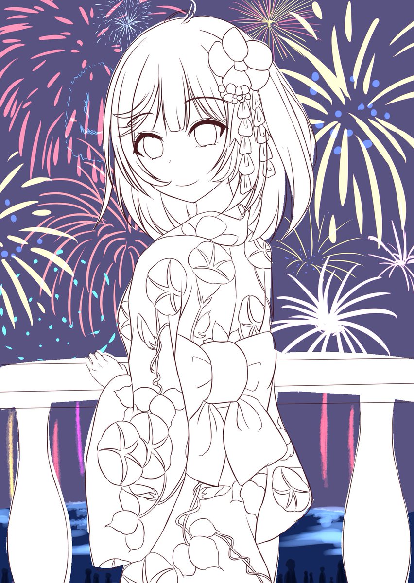#アトリ絵 とりあえず線画。 花火を背景にソフィー先生が振り返ってる構図を描きたかった