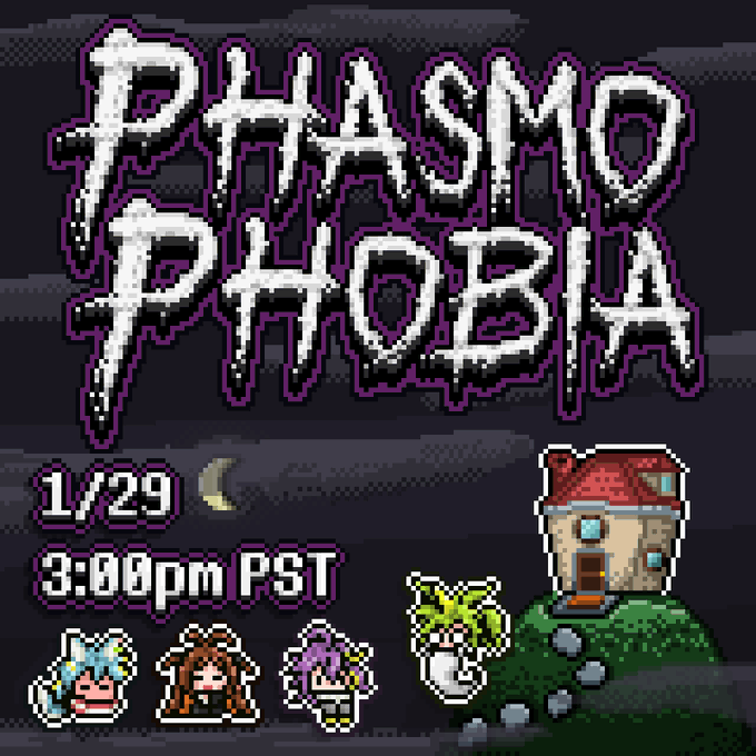 👻 PHASMO COLLAB STREAM 💀 come join me, squeed🦑 (@squ1dsup) ninaur☎️ (@xXninoegynXx), and reetz🍌 (@RTZ_vt) this Sunday 1/29 at 3:00PM PST on playing Phasmophobia and hopefully not d-wording!! 🎨: me #pixelart#ドット絵