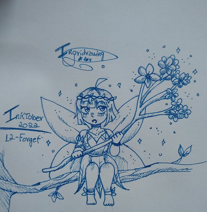 O tema de hora era forget, não tive muita ideia então eu fiz uma fada segurando um ramo de flores que se chama "forget- Me-Nots", tentei usar uma caneta diferente mas achei difícil de usar um deslise e já era. #Inktober #inktober2022day12 #inktober2022 #inktober2022day12forget