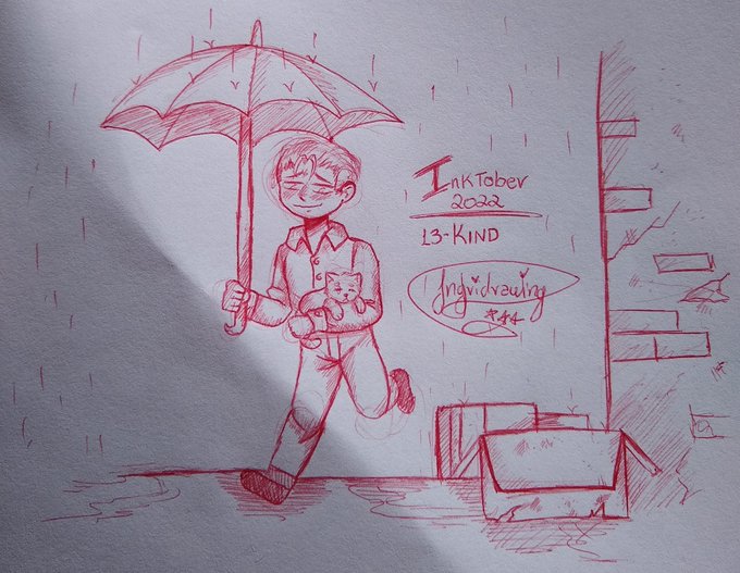 Tema de hoje foi gentil, então eu fiz clichê de resgatar um animal em uma caixa debaixo da chuva Kkkk, tive que fazer as presas que ate a folha dobrou um pouco. #inktober2022 #Inktober #inktober2022day13 #inktober2022day13kind #inktoberday13 #inktoberday13kind #inktober2022kind