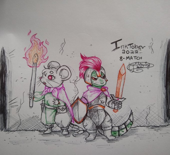 O tema de hoje foi um tema com vários significados como igualar, o fósforo, combinar etc, então eu fiz o mais simples kkkk dois animais num mundo de rpg segurando um fósforo como tocha, adorei usar as canetas coloridas. #inktober2022 #inktober #inktober2022match #Inktoberday8