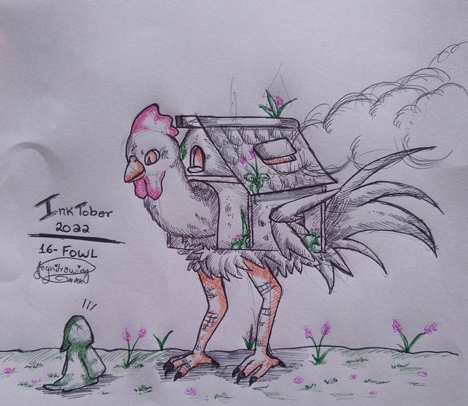 O tema de hoje foi galinha? Kkkk eu não tinha ideia então fui pro Pinterest para inspiração e me apareceu uma casa com pernas de ave...então eu fiz uma galinha gigante dentro de uma casa KKKKK #Inktober #inktober2022 #inktober2022day16 #inktober2022day16fowl #inktober2022fowl