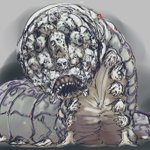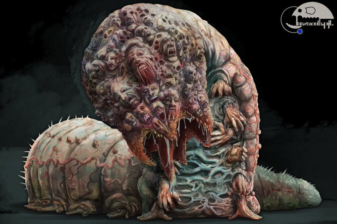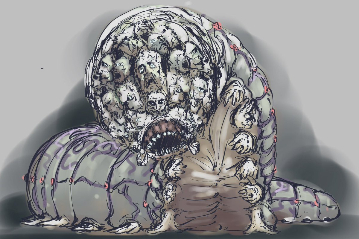 チャコタ 魔術師の儀式によって誕生する生物。青白い芋虫のような姿で、大きさは2mほどある。チャコタの顔は犠牲者の顔だ。その一つ一つで噛みつき、貪り食うという。 #クトゥルフ神話TRPG #神話生物素材集リメイク