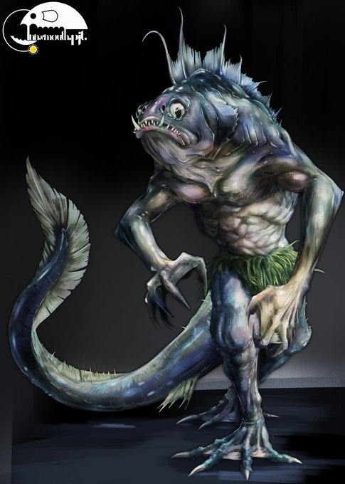 深きもの 人と変わらない体格をした奉仕種族。探索者たちもよく戦う相手なだけに侮られてる気がする……新クトゥルフ神話TRPGでは近接攻撃が45%に強化されたぞ!! #クトゥルフ神話TRPG #神話生物素材集リメイク