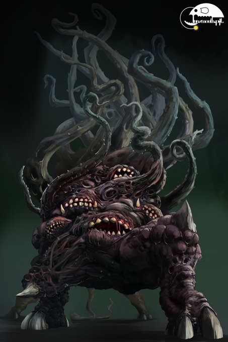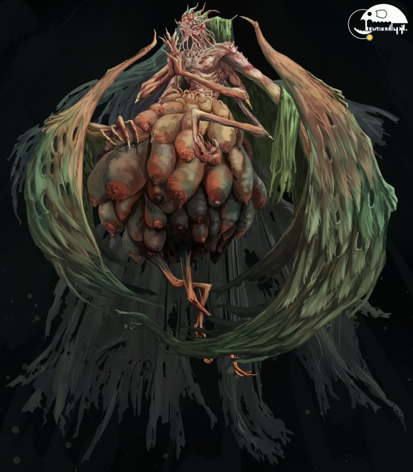 イブ=ツトゥル グレートオールドワンとも外なる神ともいわれるが詳細は分からない。シュブ=ニグラスの子ともいわれる。情報を管理する図書館のような存在で、クレドの密林でゆっくりと回っているらしい。無数の乳房が特徴で、常に無数の夜鬼が張り付いて乳をすすっている #クトゥルフ神話TRPG