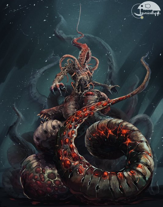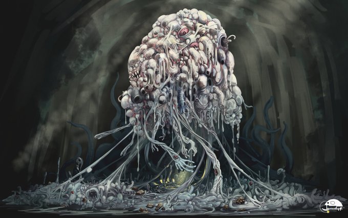モルディギアン 納骨堂の神として食屍鬼に崇められる存在。その姿は不定形で雲のような肉塊であったり、四肢のない円柱状の芋虫のようでもある。見上げるほどの巨体は目も眩むほどの光を放つらしい。 #クトゥルフ神話TRPG #神話生物素材集リメイク