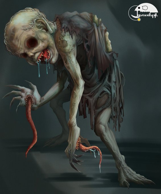 イゴーロナクの従者 イゴーロナクの僕であり、食われては生まれ変わる存在だ。小柄で赤子のような姿をしている。眼球は無く、手のひらには口がある。イゴーロナクの従者の囁きは、人間を堕落させる力を持つ。 #クトゥルフ神話TRPG #神話生物素材集リメイク2