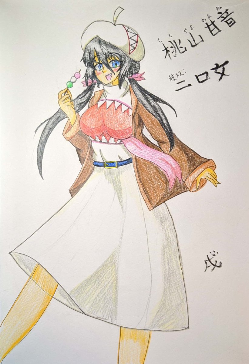 オリキャラの桃山甘音ちゃん描きました。 だいたいこんな感じです。 描いてないですが、もちろん後頭部にも口があります。