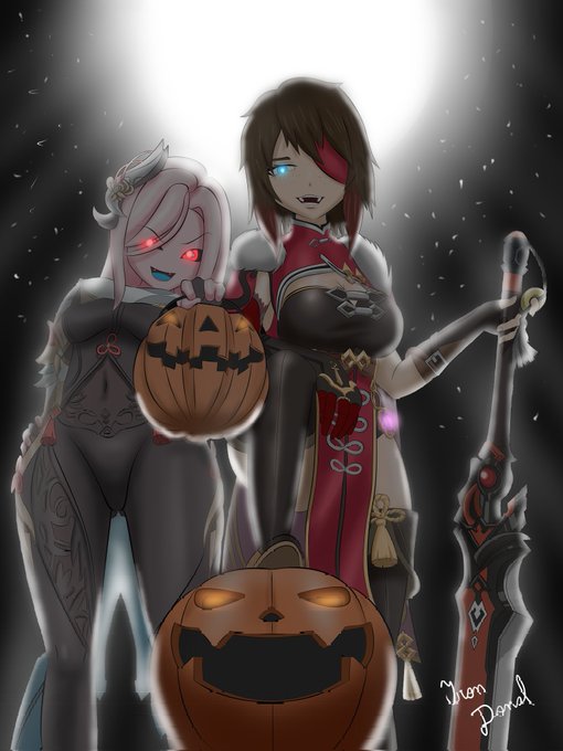 Happy Halloween, I made a collaboration drawing between my oc Lucy and @Daniela64771608 oc with a genshin impact theme. #Halloween #GenshinImpact #genshinimpactfanart