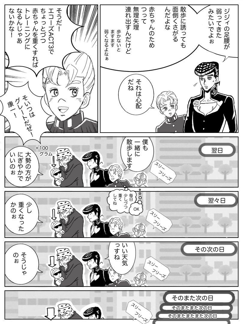 3月28日、康一くんお誕生日おめでとう(遅い)🎂✨去年描いた作品ですが、後から気付いたんですけどACT3の能力って「近いと強く(重く)、離れると弱く」なるけどこのマンガのように「○キロにする」ってできるんでしょうか?🤔 #ジョジョ好きさんと繋がりたい #広瀬康一誕生祭