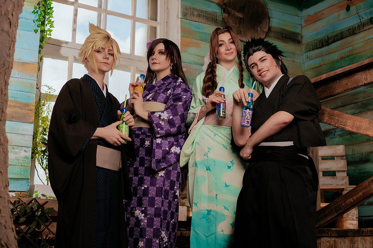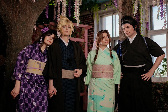 Одно из самых приятных воспоминаний этого года) 💗Aerith by @stayslay 🖤Zack by @Delsin_Graves 💙Cloud by @Renton_Torston 💜Tifa by me ✨Ph.: @GALAXYGILLAN 🌟Kimono: @RRikemika #FinalFantasy #FinalFantasyVIIRemake #FFVIIR #cosplay