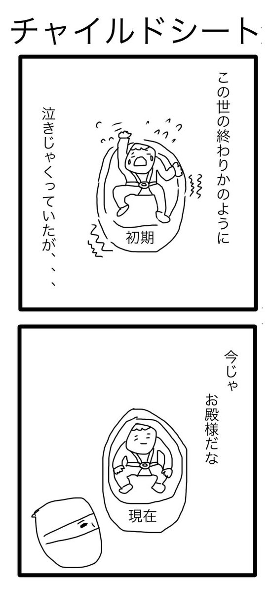 チャイルドシート乗せると爆泣きの赤ちゃんもしばらくすれば慣れます。ご案内下さい。パパ、ママもうしばらく辛抱を。 #子育て #育児 #漫画が読めるハッシュタグ #ゆるいイラスト #忍者 #ニンジャ #チャイルドシート