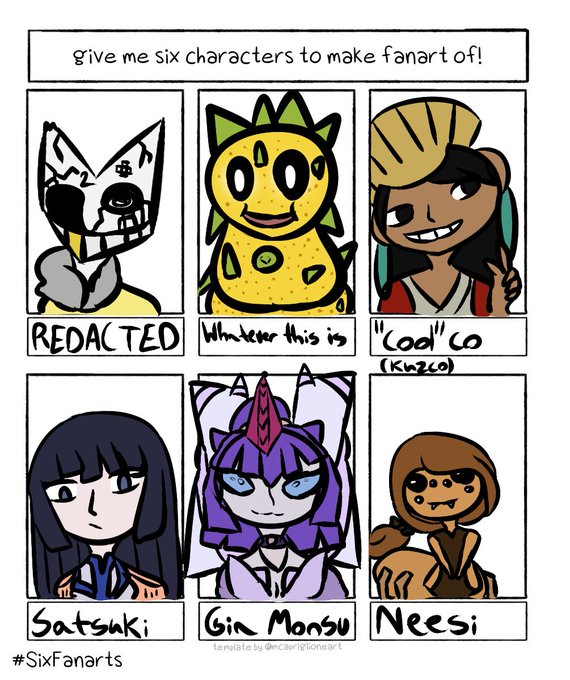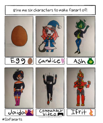 Here they are, 6 fanart of OCs and Characters! Thanks to everyone who submitted, sorry if yours didn't get chosen, maybe next time! (Big thanks to Eggy for cropping them in and adding cute little drawings in there) #SixFanarts #traditionalart #ArtistOnTwitter