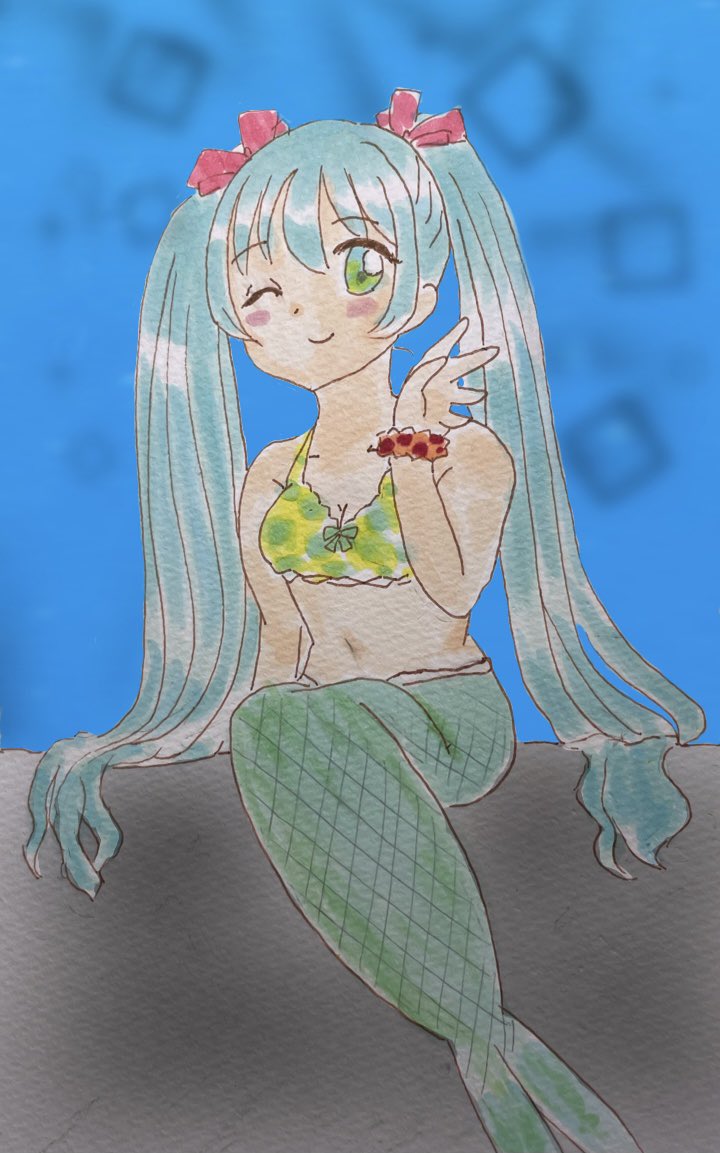 人魚ミク描いた🧜♀️(背景はデジタル) #初音ミク #アナログ #デジタル #イラスト基地
