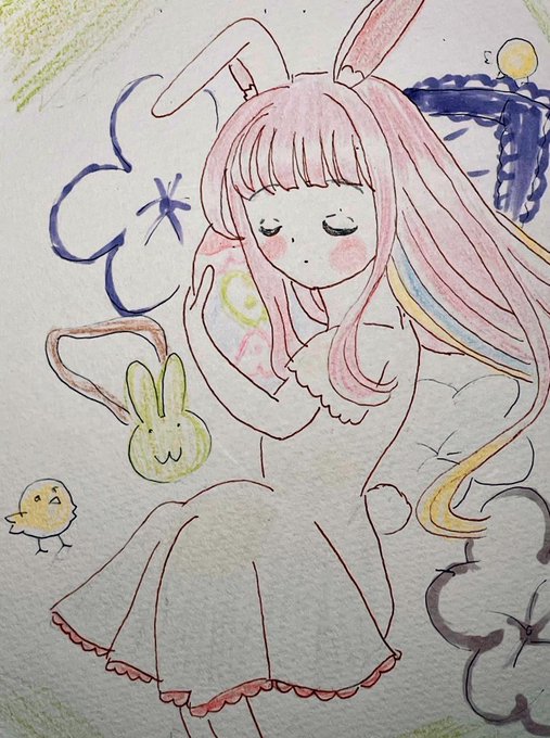 #春爛漫お絵描き大会2021 #アナログ #色鉛筆 イースター〜寝ているウサギの女の子と卵〜