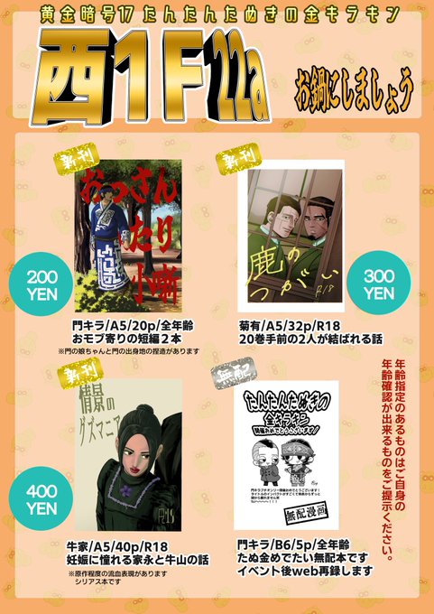 6/26黄金暗号のお品書きです 通販はイベント後準備出来次第お知らせします 各新刊サンプルはこちらから↓ 門キラ本pixiv.net/artworks/99039… 菊有本pixiv.net/artworks/99039… 牛家本pixiv.net/artworks/99039…