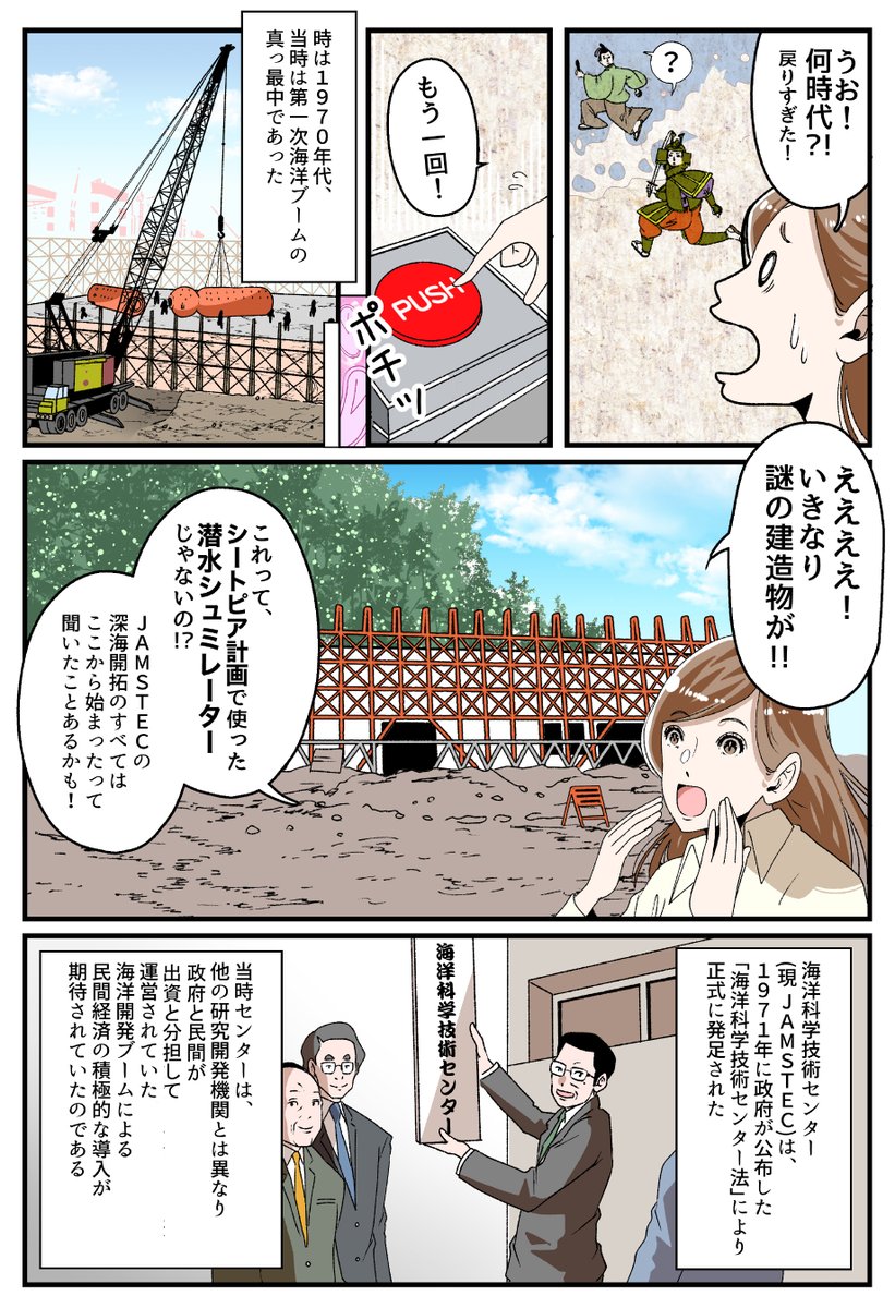 5 7 【ジャムコミ!】新人ナビちゃんの潜航記録 DIVE2~半世紀前!エモい~ 謎のスイッチを見つけたナビちゃん。押してみるとJAMSTEC創立当時の夏島町にタイムスリップ!?労災事情を気にしつつ、約半世紀前に潜航開始!? #JAMSTEC #JAMSTEC50th #ジャムコミ #漫画 #漫画が読めるハッシュタグ 21/05/28 17:38