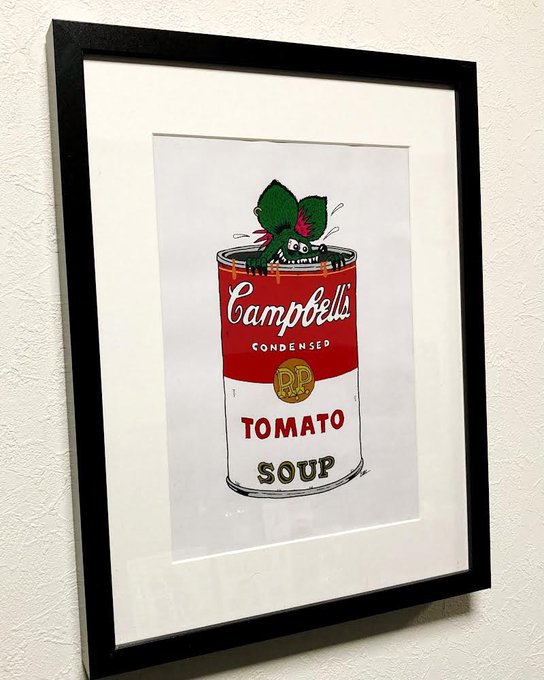 部屋の模様替え用に。 ふと、、閃いて描いてみたイラスト♪ あの有名アートを自分流にカスタム。 スープ缶の中には、、ネズミw 速攻で仕上げた割にはなかなか(゚∀゚) #イラスト
