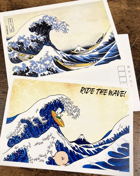 1 19 以前描いたサーフィンスヌさんをポストカードにしてみた♪ この2枚を並べて撮影したかったんです。 なので、、葛飾北斎氏のポストカード発見して即買いしましたw #イラスト 23/06/24 08:01