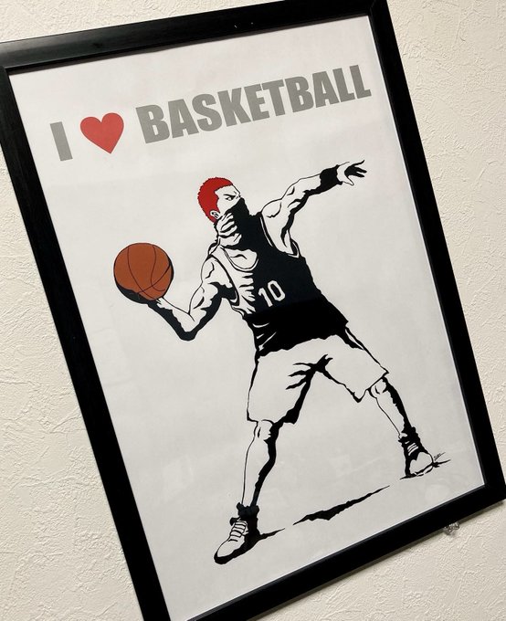 天才桜木くんをあのストリートアート風に描いてみました(^^) スラム、、ダンクシーw 額装したらアートっぽくなった♪ 結構お気に入り。 #イラスト