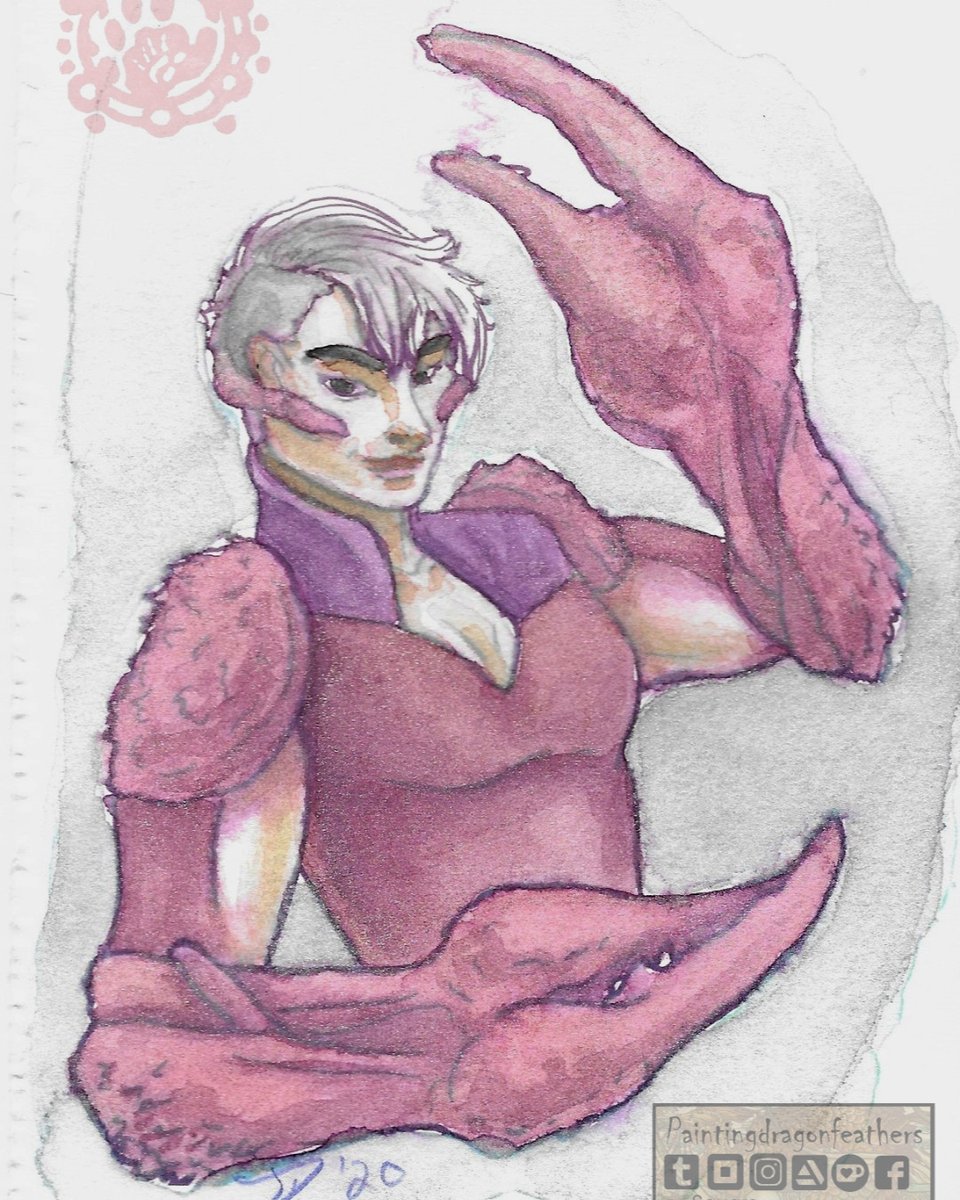 Next up on the #sixfanarts requests--Beau from Dragon Booster, as requested by Carolyn Feiring! I vaguely remember watching this show as a kid, and those EPIC DRAGON CHINS it. XD #beau #dragonbooster #fanart #watercolor #illustration #paintingdragonfeathers