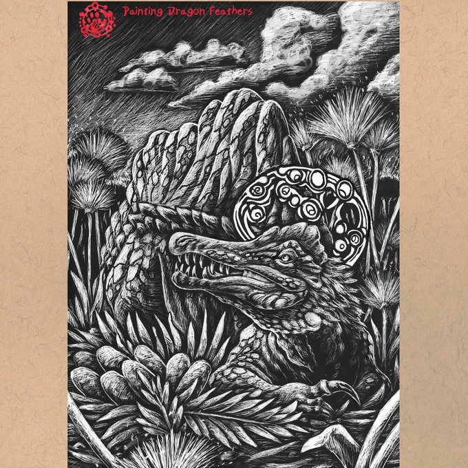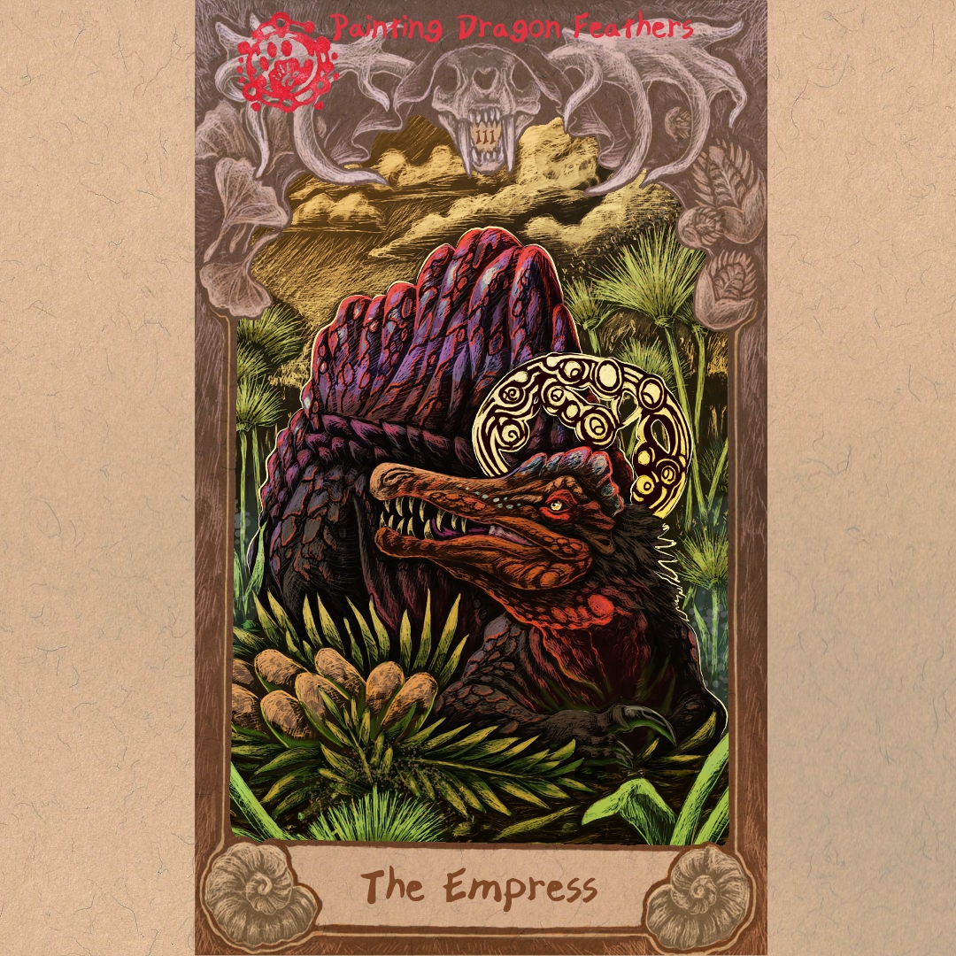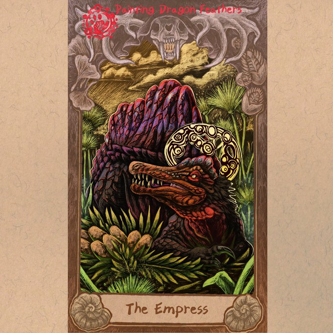 In tarot, the Empress is a nurturing, maternal presence, that reminds us to extend as much care and compassion to ourselves as we do others. #spinosaurus #empress #tarot #scratchboard #paleoart #paintingdragonfeathers #illustration #artistsoninstagram #dinosaur #empresscard