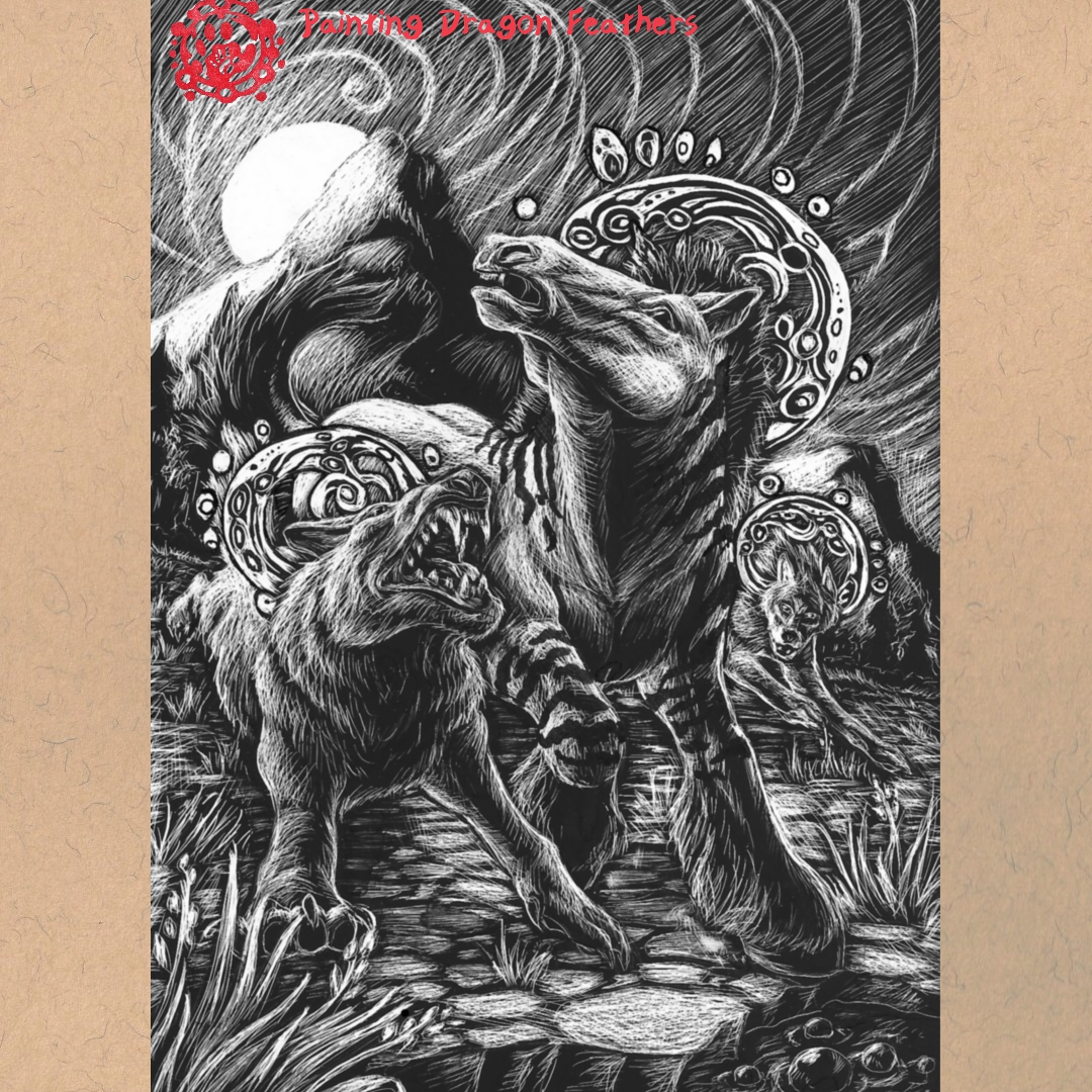 Since dire wolves and ice age horses both went extinct around the arrival of humans to North America, overhunting may be to blame. #paleoart #tarot #fossil #extinctanimals #scratchboard #horse #wolf #direwolf #thechariot #art #paintingdragonfeathers #creature #animal