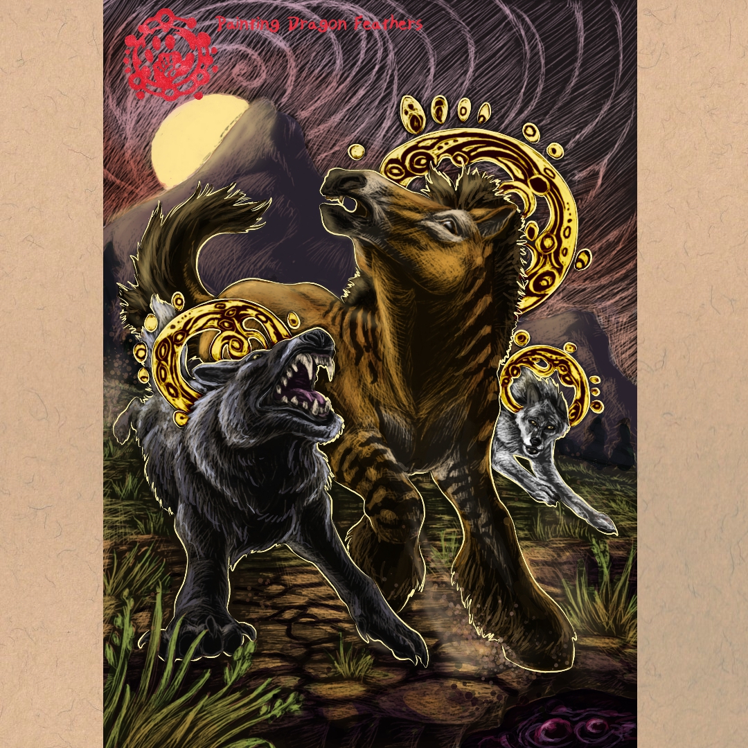 Horses were once native to North America for millions of years before going extinct in the ice age, then being reintroduced by western colonizers. #paleoart #tarot #fossil #extinctanimals #scratchboard #horse #wolf #direwolf #thechariot #art #paintingdragonfeathers #creature