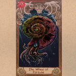 The Wheel of Fortune reminds us our luck turns beyond our control. Instead of struggling against the turn of the wheel, we should embrace the ride through inevitable change. #paleoart #tarot #extinctanimals #scratchboard #art #artist #ammonite #wheeloffortune #fossil