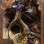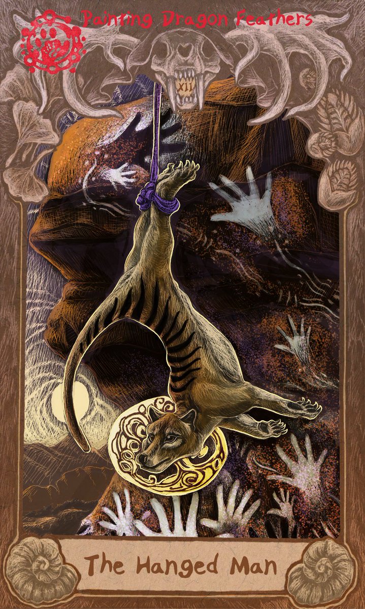 I chose the thylacine for the Hanged Man card cause there’s a famous photo of a hunted thylacine strung upsidedown. #tarot #dinosaur #illustration #paintingdragonfeathers #scratchboard #paleoart #fossil #extinct #fauna #hangedman #thylacine #tasmaniantiger #tasmanianwolf