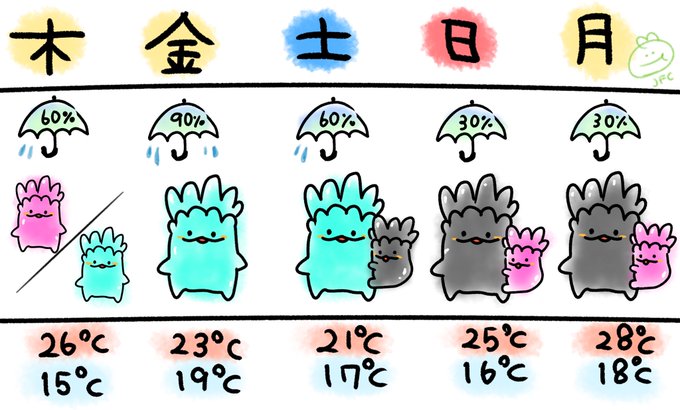 今週の天気予報☂️☀️☁️ ☔️☁️マーク多くて憂鬱になりそうだったのでジェリーで表示してみたら…✨ 憂鬱→ニヤニヤになりました( ˊ̱˂˃ˋ̱ )🙌 #フォートナイトイラスト #FortniteArt #ゆるいイラスト