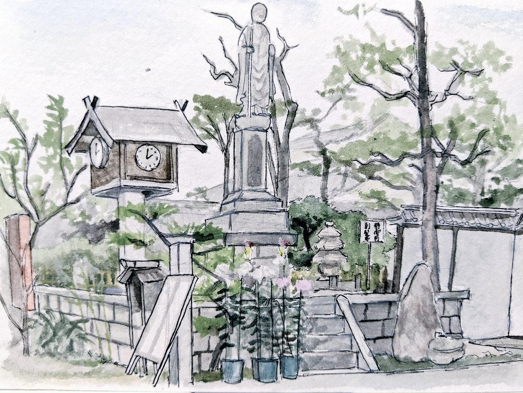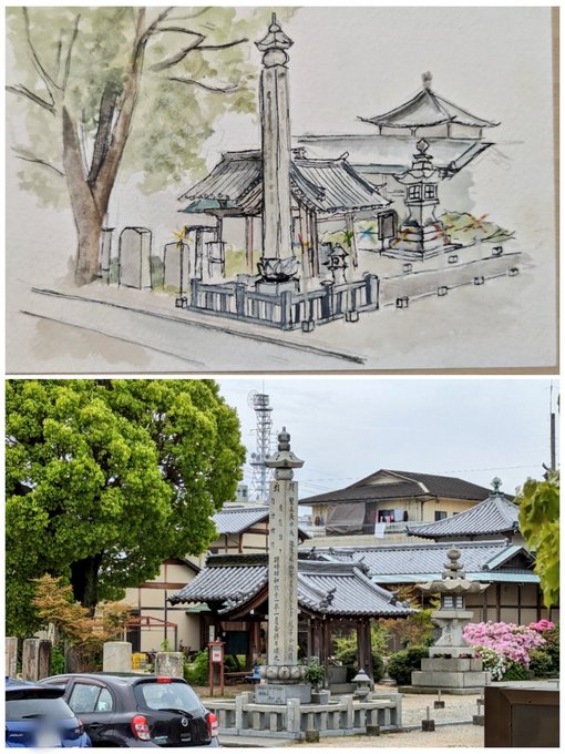 現在 #四国八十八箇所巡り の時のお寺のツイートには2周目の時に描いた各寺のイラストも掲載していますが、これはハガキサイズの紙に携帯用の水彩画材で60分一本勝負で描いたもの。 中には90分掛かった寺や、雨天や暗所(何色で描いているか分からない)で悩む寺もありました。多めに見てやって下さい。