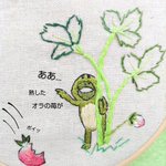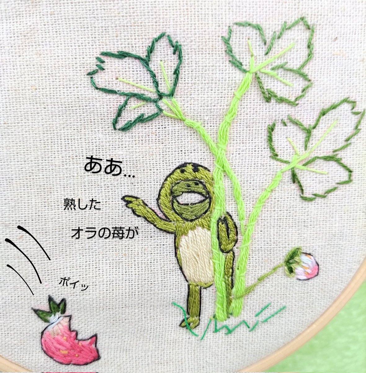 先日、雨が降る前に、赤い苺は全部収穫しました。虫食いが酷いやつは、その場に捨てました。 ちょっと凍らせてから、一気に全部食べました。 満足💗🍓❄️😚💨ゲフッ カエル「オラの苺全部持ってかれちまったズラ… 」 #畑 #カエル #落書き #刺繍