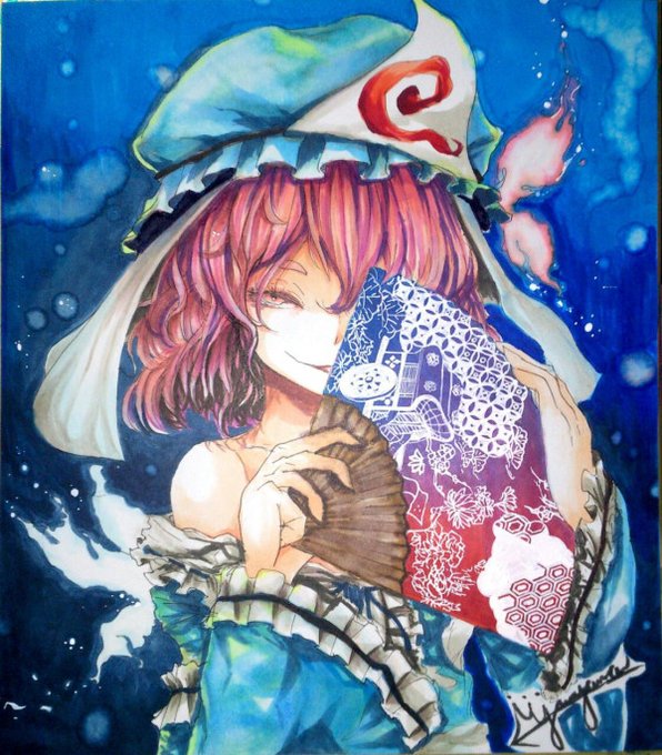 数年前に色紙で描いた幽々子。今見ても書き込みおかしかったなこの絵。 #過去絵を投げて絵を描いた気になろうキャンペーン #アナログ #コピックイラスト