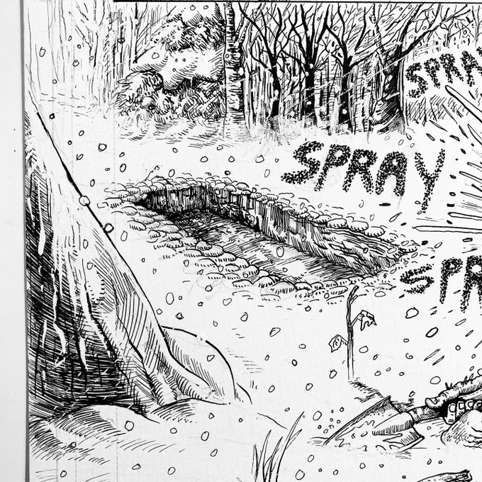 Background trees and snow. Onto the next page #art #comics #ink #inktober2021 #comicart #comicartist #indiecomicsart #horrorcomics #cartooning #snow #blackandwhitedrawing