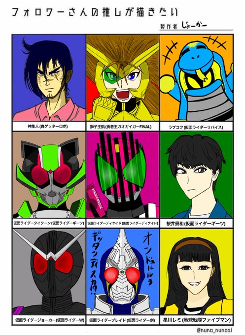 遂に完成しましたー‼️ 仮面ライダー系が特に描くの難しかった… 今回キャラ指定して下さったフォロワーさん達 (@8941_yuto @56SAh2JXSUVvh7B @aitorayellow @oonanoru @AR0216_GGG @Dsp43dR7Ze3uqU0 @kaiserskl2010 @human15688980 @Nakacha71144196 ) #フォロワーさんの推しが描きたい